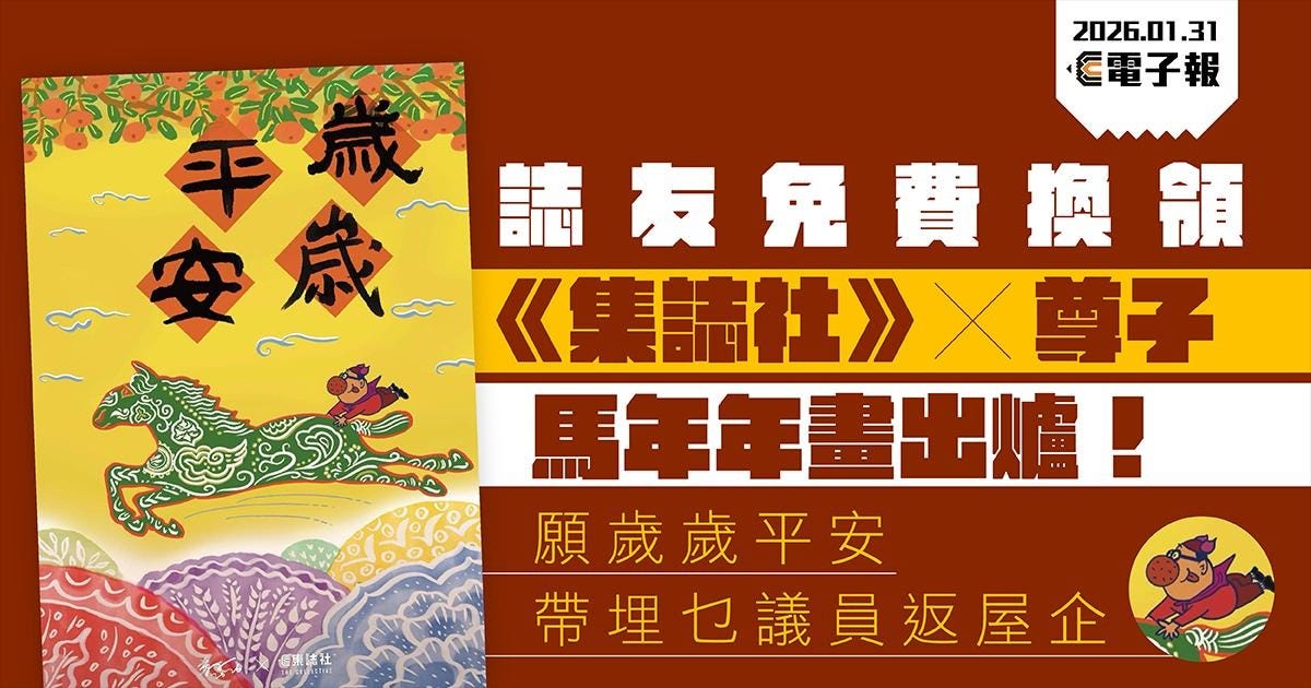 為答謝誌友支持、同行守護新聞自由,誌友可透過此表格填寫訂閱所用電郵,我們在核對紀錄後,會透過電郵回覆換領編號。誌友憑編號,可在 2 月 4 日(星期三)至 14 日(星期六)期間,到位於太子的留下書舍換領價值 $68 的年畫(海外訂閱者亦可登記、將換領編號交予他人代領)。我們自家設計的利是封尚餘少量存貨,歡迎加 $20 購買一套 10 個利是封,在新年期間向親友送上祝福。所有收入扣除成本,將用作《集誌社》營運、支持我們在地報道。