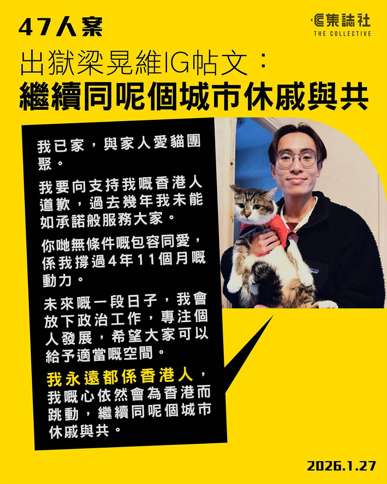 47人案|梁晃維出獄 IG 帖文:我永遠都係香港人,繼續同呢個城市休戚與共