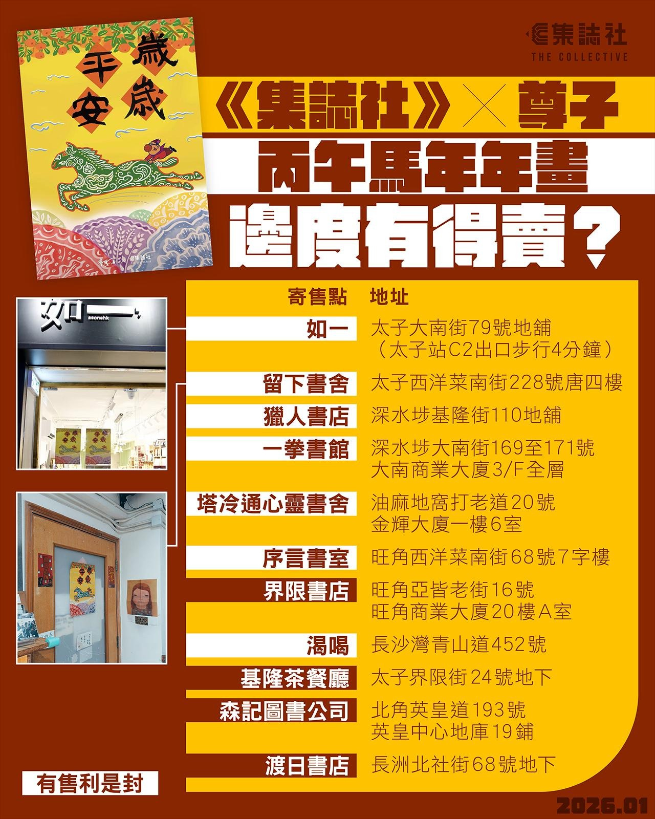 轉眼間,《集誌社》今年 2 月便踏入第四年運作,我們將與誌友共渡第三個農曆新年。一如過去兩年,我們邀請尊子為我們創作年畫,為誌友送上祝福;丙午馬年年畫近日出爐,已上架各大獨立書店,歲歲平安價 $68。