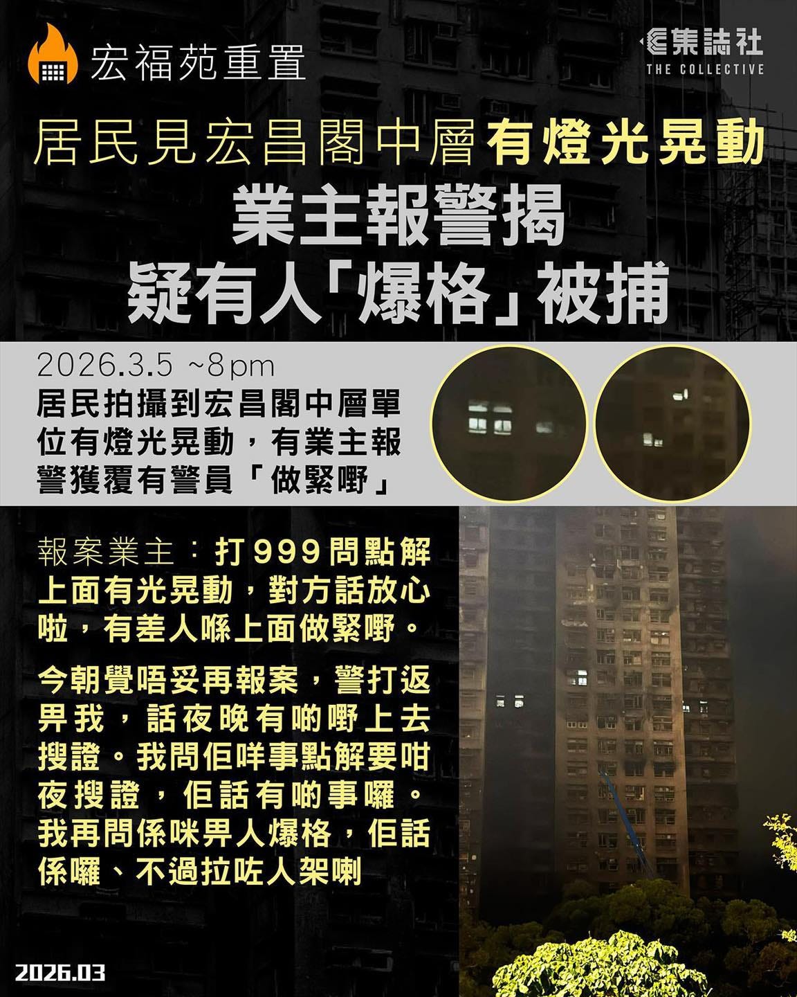 宏福苑火災|居民見燈光晃動 報警揭疑有人「爆格」被捕 警:拘三工人